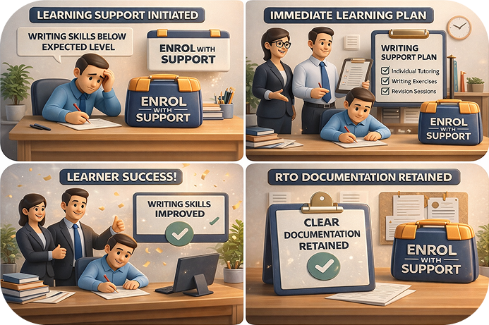 A learner’s writing skills were below the expected level. The kit flagged “Enrol with support” and produced an immediate learning plan, helping the learner succeed and the RTO retain clear documentation.